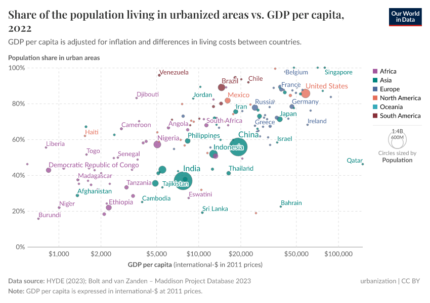 In the chart, we show the relationship between the share of the population living in urban areas on the y-axis, and average income (gross domestic product per capita) on the x-axis. Here we see a strong relationship between urbanization and income: as countries get richer, they tend to become more urbanized.