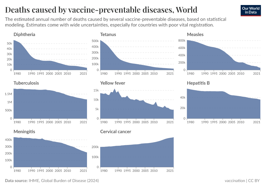 In contrast, the decline in deaths from diseases like hepatitis B and cervical cancer has been more gradual. This is because these diseases typically cause illness and death much later in life, often decades after infection. As a result, the benefits of vaccination take longer to become visible in mortality trends, especially when it was introduced in recent decades.
