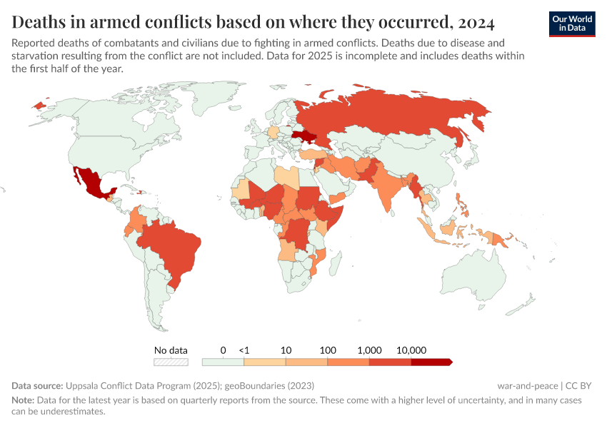 Our team has created two additional Data Explorers to make even more data on armed conflicts and war easier to access and understand. They provide and explain data from six leading datasets: on how deadly and common they are, which countries are involved, and where they take place. You can learn more about which measure and data source can best answer your questions in our articles explaining the metrics and datasets.