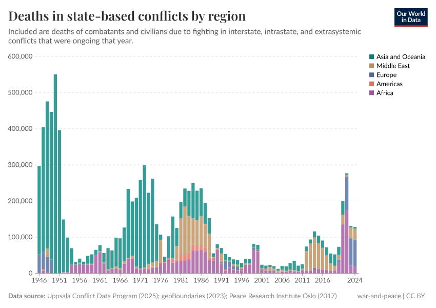 Bastian Herre, Lucas Rodés-Guirao, and Max Roser (2024) - “War and Peace” Published online at OurWorldinData.org. Retrieved from: 'https://data-auxiliary-trade.owid.pages.dev/war-and-peace' [Online Resource]BibTeX citation