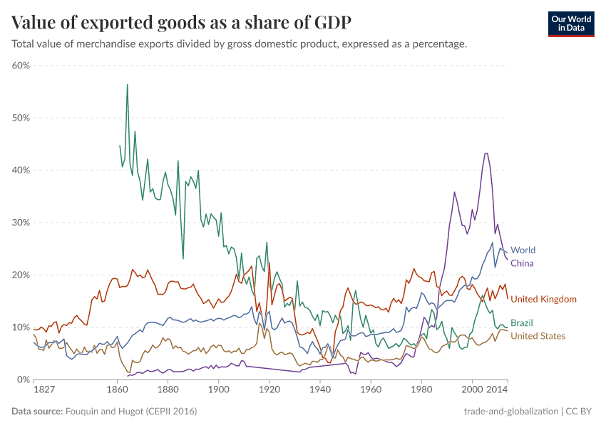 One of the key additions to the topic page are new charts exploring long-run trade estimates across countries and world regions. Here is an example: merchandise export-to-GDP ratios from 1827 up until 2014.