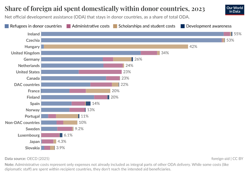 In many countries, a significant share of aid is spent domestically on hosting refugees, offering student scholarships, and administrative costs.