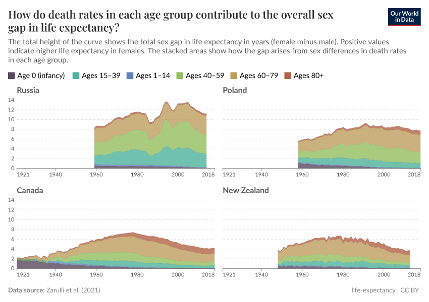 The chart below shows that there are also differences between countries. In Russia and Poland, for example, the overall sex gap in life expectancy is still large due to higher death rates in young and middle-aged men than women.