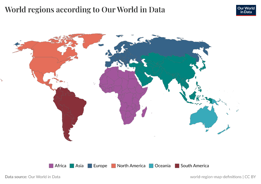 If you’re looking at a chart on Our World in Data and see a region labeled simply as “Asia” or “Europe”, that means it’s using our definitions. If you see a source noted in brackets (e.g., “East Asia and Pacific (WB)”), it’s using that source’s regional scheme.