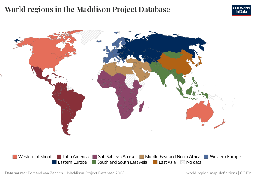 The Maddison Project Database defines eight world regions: East Asia, Eastern Europe, Latin America, Middle East and North Africa, South and South East Asia, Sub-Saharan Africa, Western Europe, and Western offshoots. This map shows how they are defined.