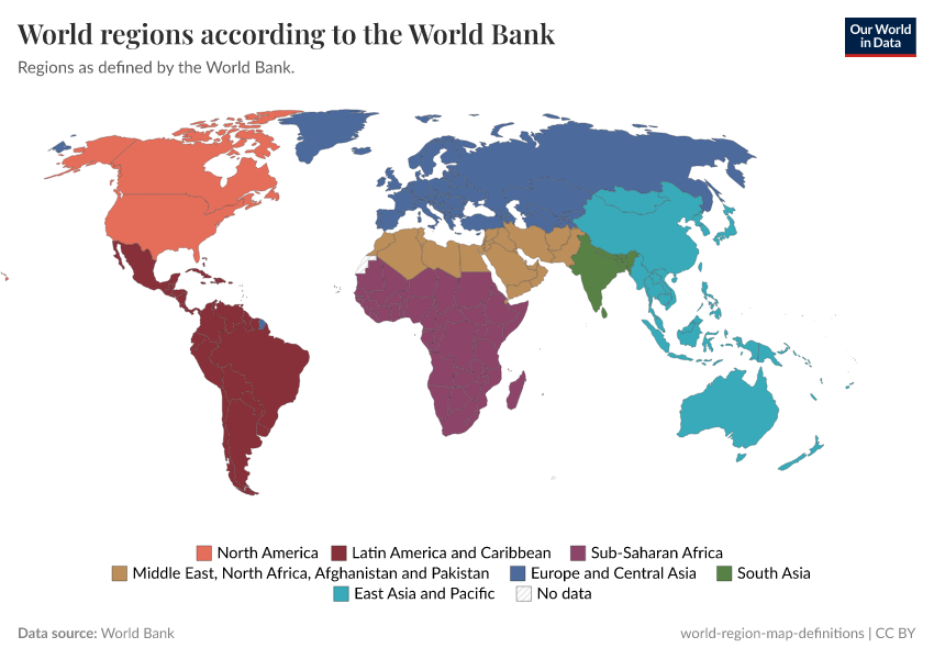 The World Bank defines seven world regions: East Asia and Pacific, Europe and Central Asia, Latin America and Caribbean, Middle East and North Africa, North America, South Asia, and Sub-Saharan Africa. This map shows how they are defined.