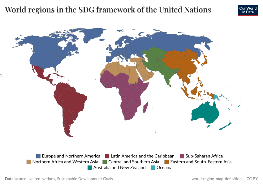 When reporting data on the Sustainable Development Goals, the United Nations defines eight world regions: Australia and New Zealand, Central and Southern Asia, Eastern and South-Eastern Asia, Europe and Northern America, Latin America and the Caribbean, Northern Africa and Western Asia, Oceania, and Sub-Saharan Africa. This map shows how they are defined.